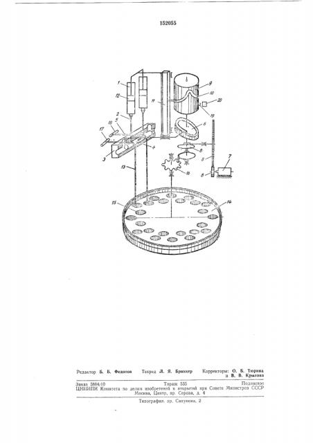 25 столик 14 с двумя рядами гнезд 15 под пробирки. Столик получает вращение от редуктора 8 через мальтийский крест 1б.