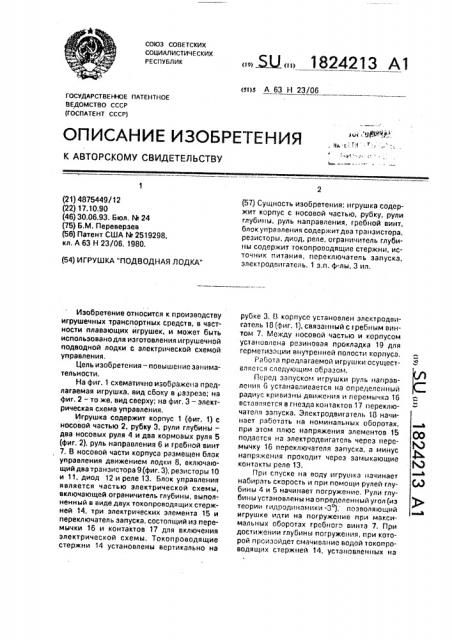 „,5U„„1824213 А1 (57) Сущность изобретения: игрушка содержит корпус с носовой частью, рубку. рули глубины, руль направления, гребной винт, блок управления содержитдва транзистора. резисторы, диод, реле, ограничитель глубины содержит токопроводящие стержни, источник питания, переключатель запуска, электродвигатель. 1 з.п. ф-лы. 3 ил. рубке 3. В корпусе установлен электродвигатель 18 (фиг. 1), связанный с гребным винтом 7. Между носовой частью и корпусом установлена резиновая прокладка 19 для герметизации внутренней полости корпуса.